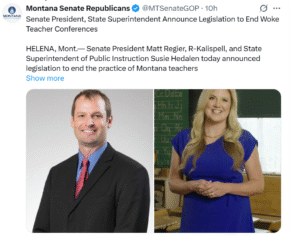 On October 27, Montana Senate Republicans shared that the Senate President, Matt Regier, and the State Superintendent of Schools, Susie Hedalen, have announced legislation to end woke teacher conferences!